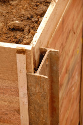 | 6月に行われた山留めの作業で打ち込まれたH型鋼に、何枚もの板が積み重ねられ土留めをしています。 | |